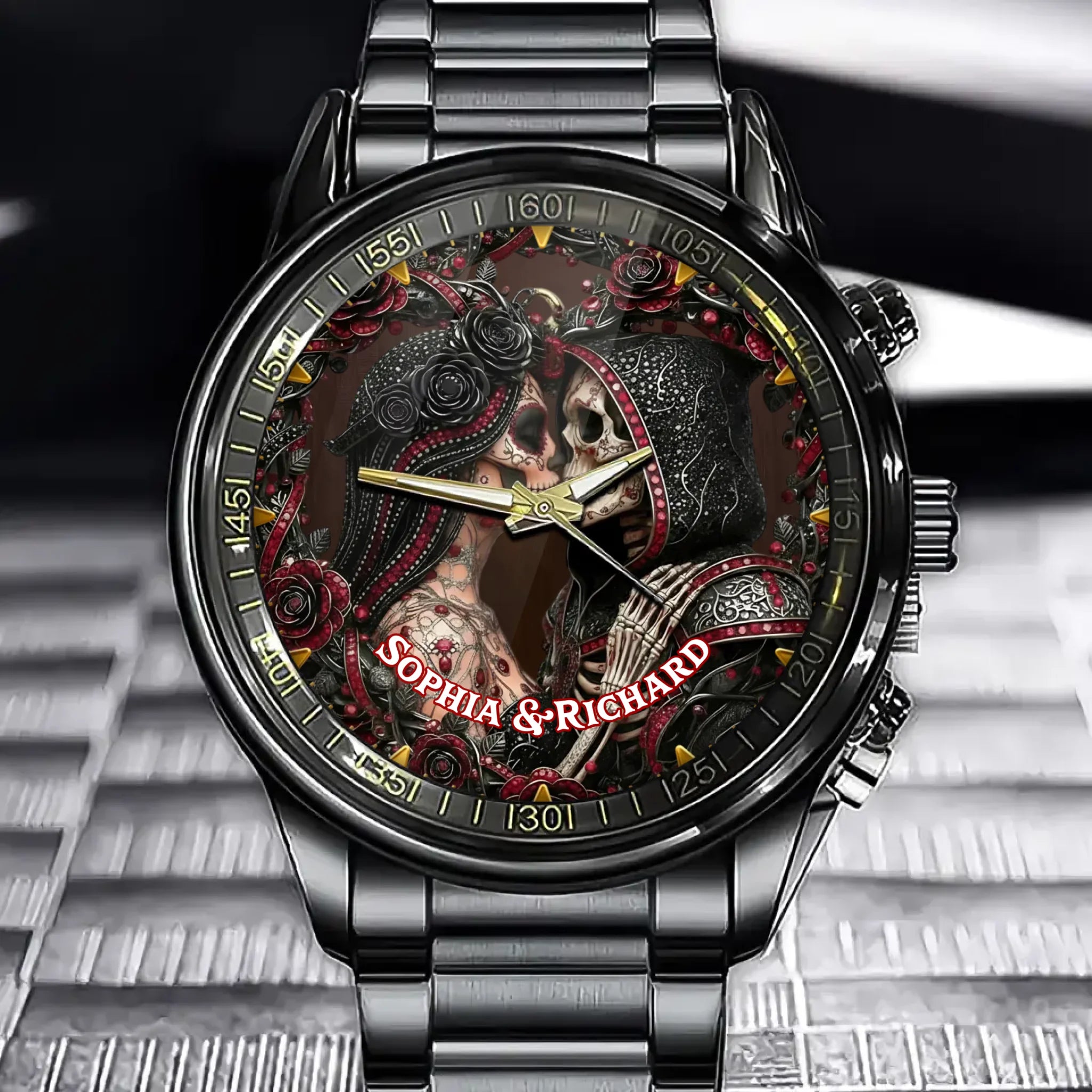 Personalized Gothic Skull Couple Watche - Custom Names Perfect For Anniversaries & Valentine's Day