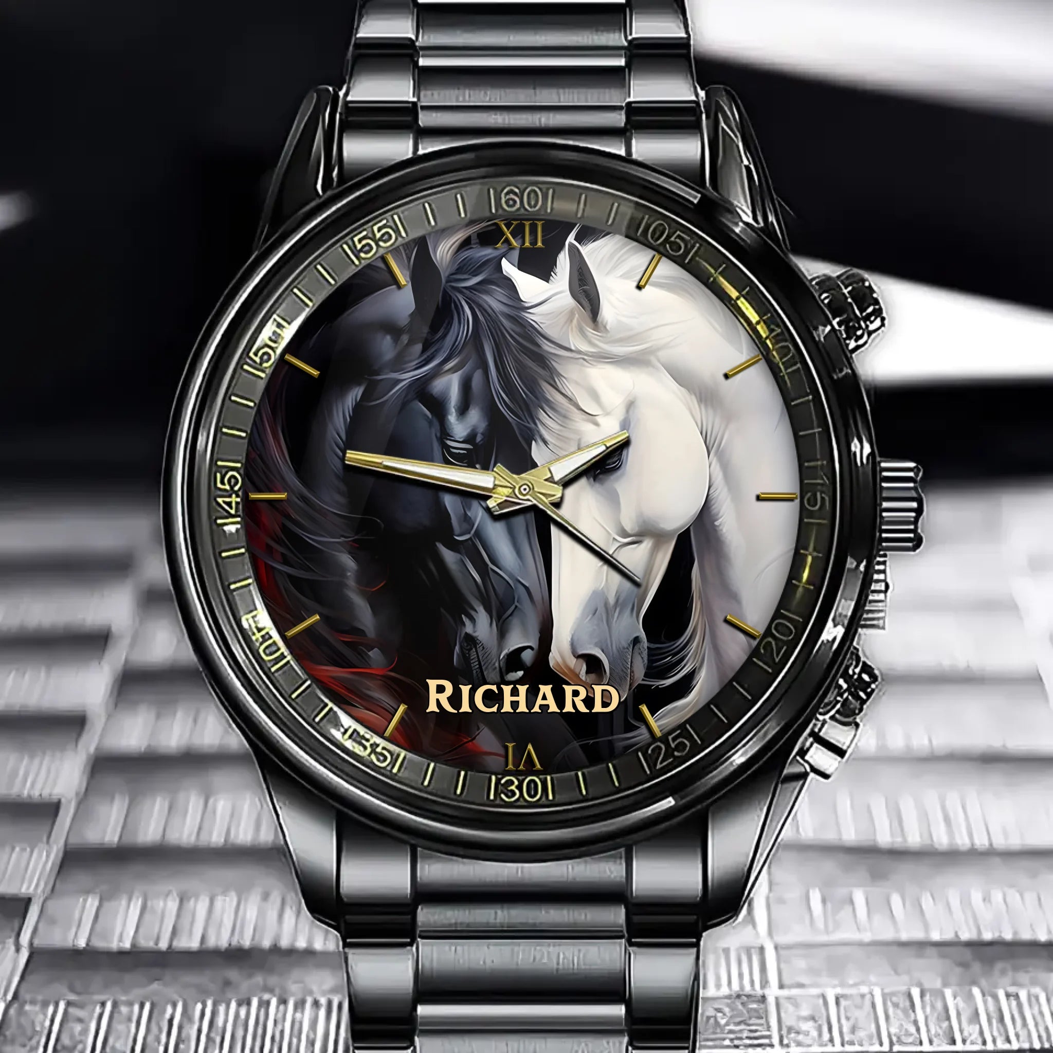 Personalized Harmony Watch – Black & White Horses Design with Custom Name