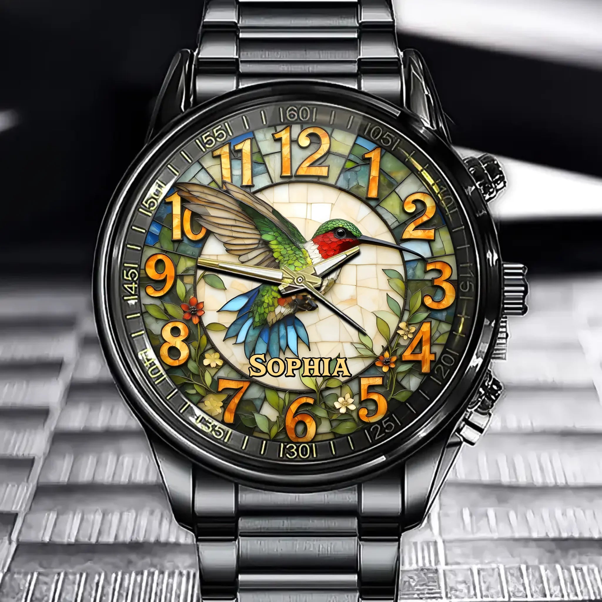 Personalized Stained Glass Print Design Watch Featuring Hummingbird, Rooster, Dragonfly, Butterfly, Woodpecker and Turtle