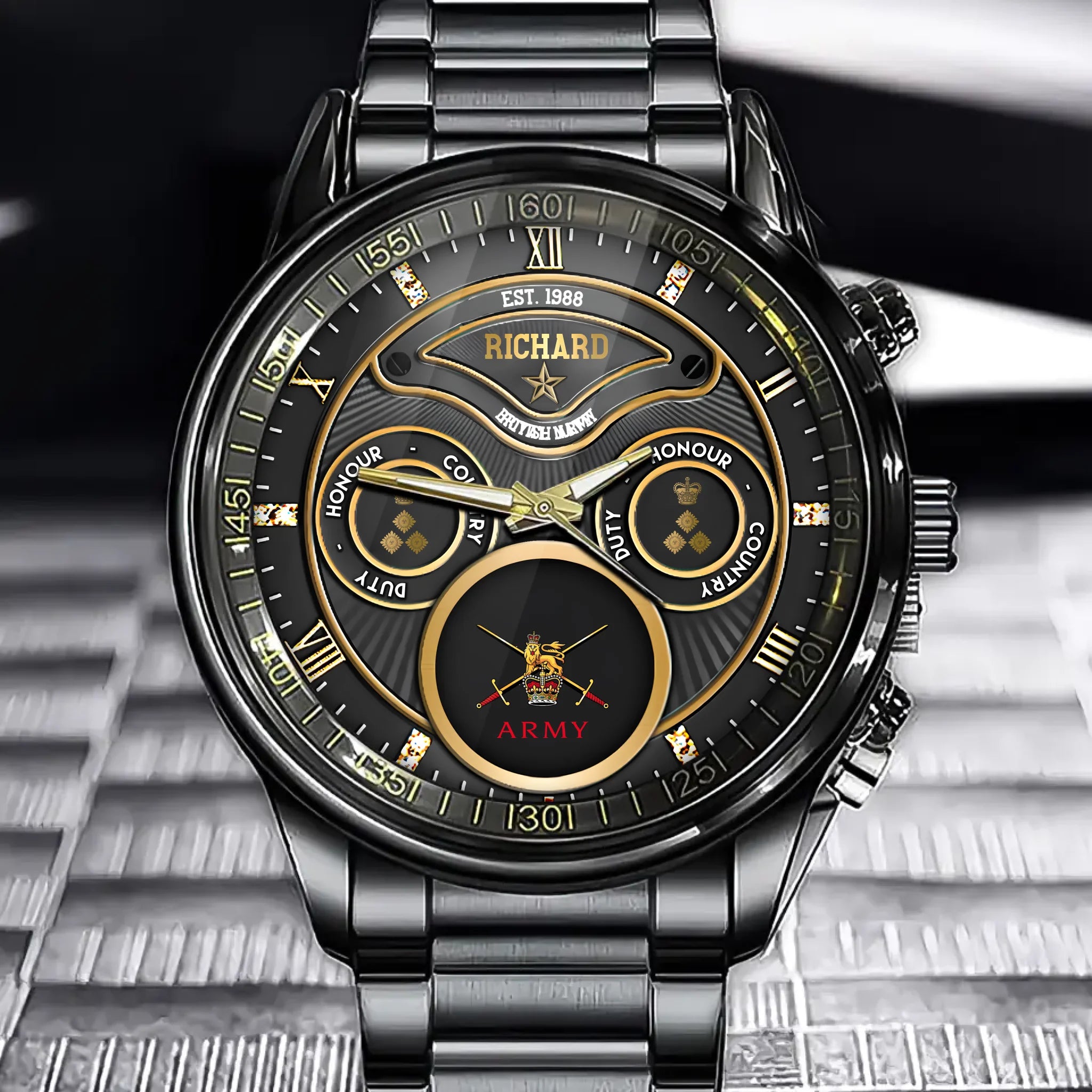 Montre en or personnalisée avec insigne militaire et grade de vétéran britannique avec nom et dates de service personnalisés