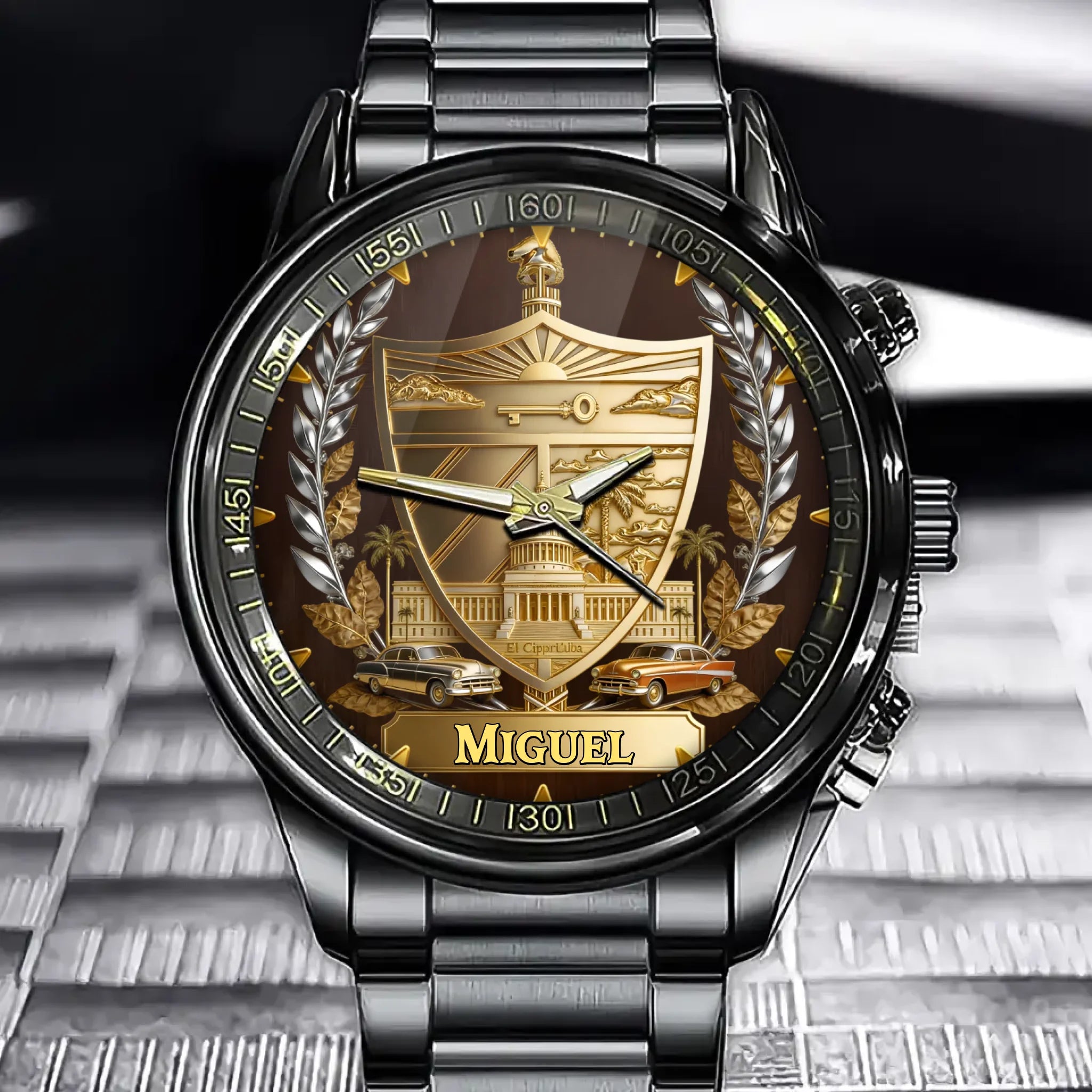 Personalized Cuban Emblem Watch – Add Your Name, Golden Shield Design