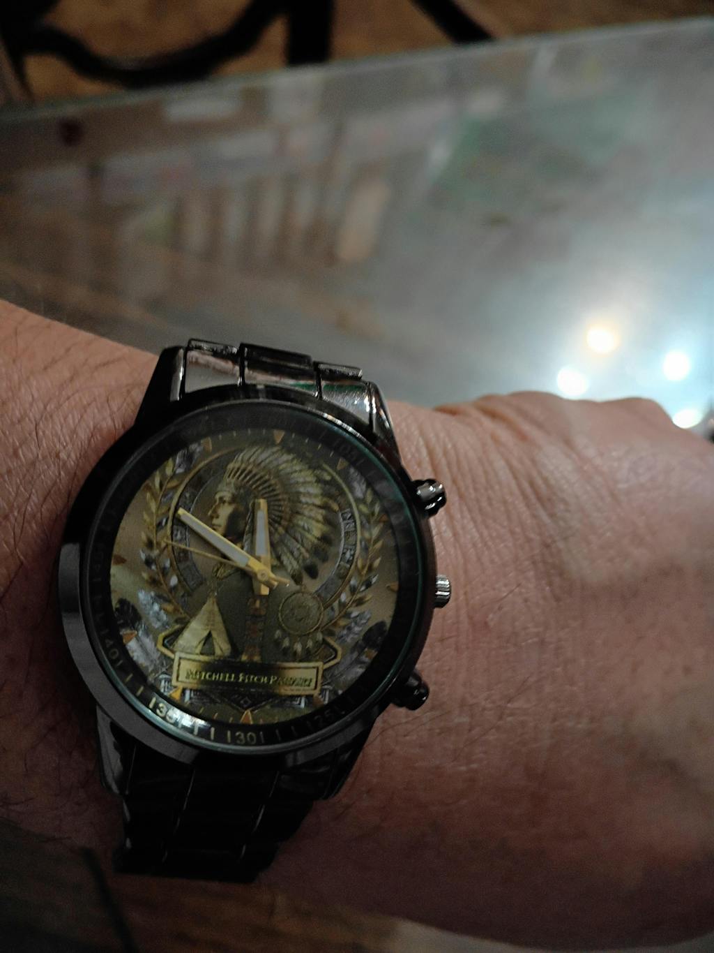 Durable alloy case with a coated glass surface.